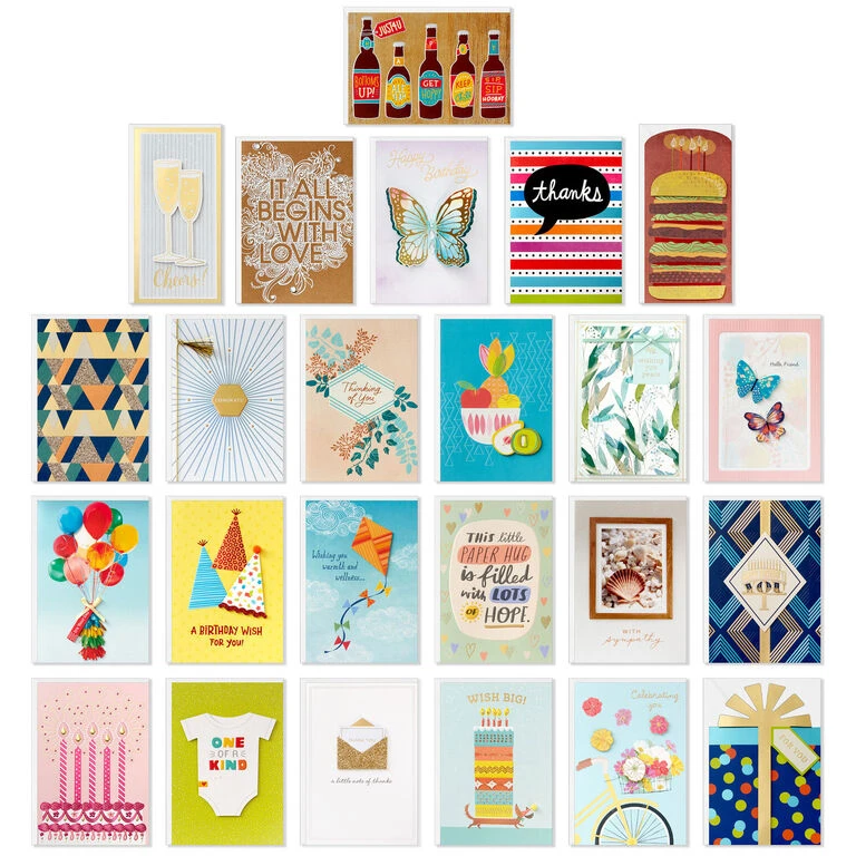• Box includes 24 assorted cards and envelopes: 8 birthday, 3 celebrate, 2 thank-you, 2 wedding/anniversary, 1 get well, 2 sympathy, 2 thinking-of-you, 1 baby, 1 encouragement, 1 friendship, 1 blank.