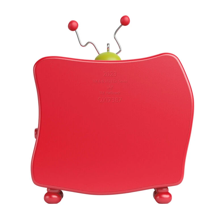 Celebrate the holiday tradition of “How the Grinch Stole Christmas!” with this delightful Christmas tree ornament. The classic Dr. Seuss story comes to life with a scene of the Grinch pondering the meaning of Christmas set inside a whimsical television. Press the button to see the screen light up and hear narration from the beloved book (battery-operated).